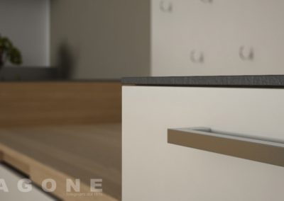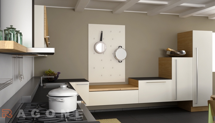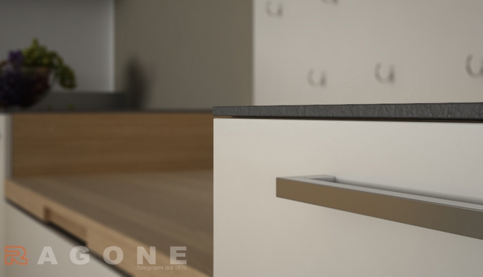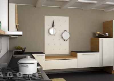 The union of the original suspended bases and the classical ones laid down on the ground. A kitchen turning workplace, where each module is conceived according to the needs of its protagonists, thanks to the professional flames and the wide and handy pot rack.