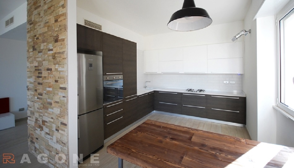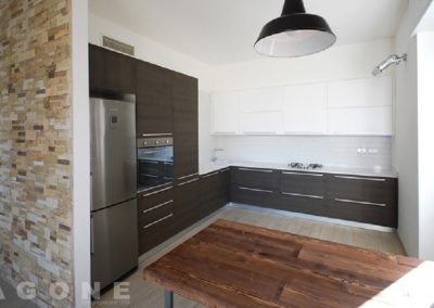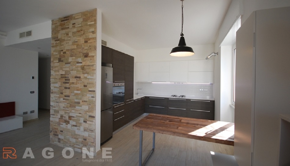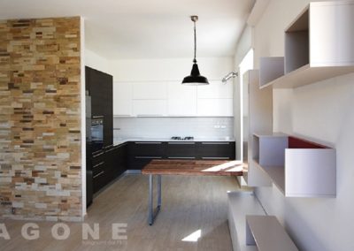 Cucina con basi in legno tranciato e pensili laccati opachi bianchi, il tutto valorizzato dal piano in Okite bianca. Zona giorno semplice e funzionale che nasconde tra le ante e i piani un tavolo telescopico che da 50cm si allunga fino a 2 metri. Tutto il sistema è finito con laccatura opaca.