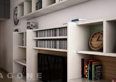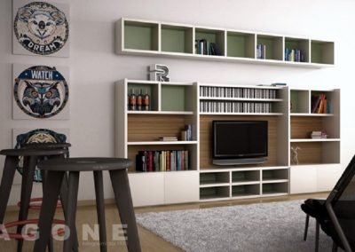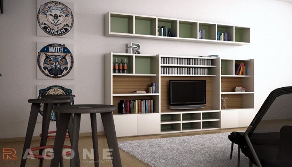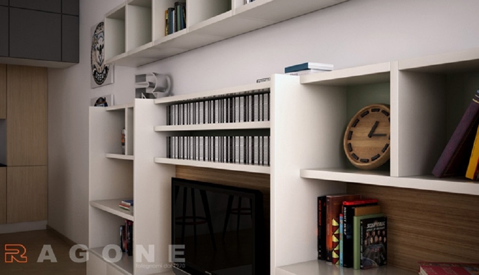 Gli elementi verticali su un piano diverso dagli elementi orizzontali donano profondità , lo scienale di colore o essenza diverso dalla struttura conferiscono più carattere.