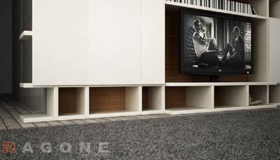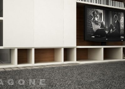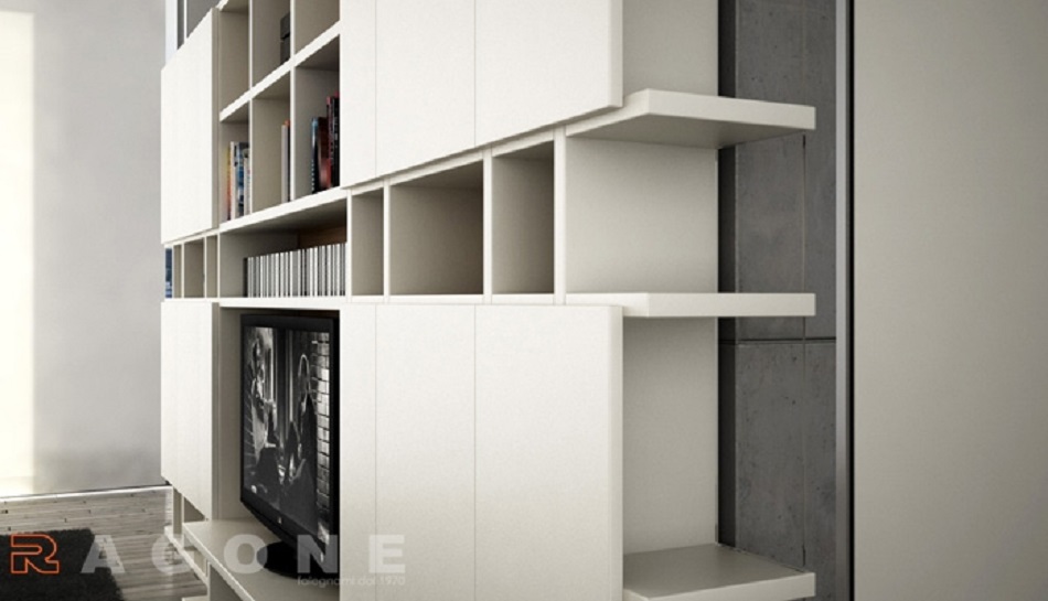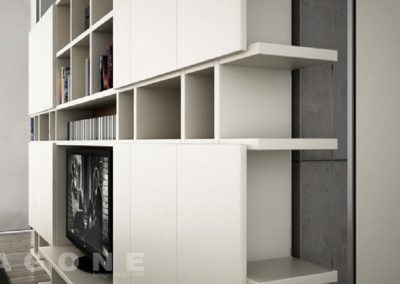 Il vetro e le mensole a sbalzo alleggeriscono la struttura, la superficie laccata dona pulizia ed esalta la linearità , il tutto arricchito dallo schienale in essenza.
