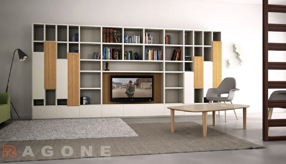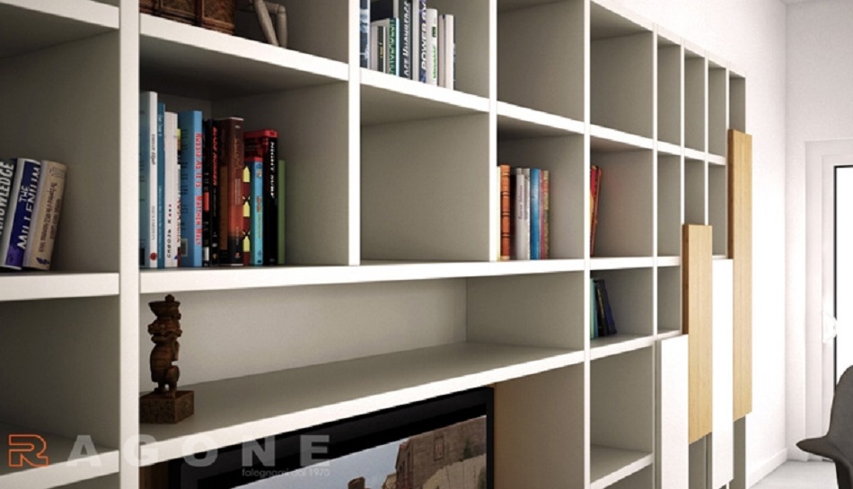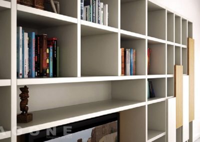 Il caos organizzato che crea equilibrio. L’andamento irregolare delle ante é la particolarità di questa libreria, che unisce estetica e funzionalità .