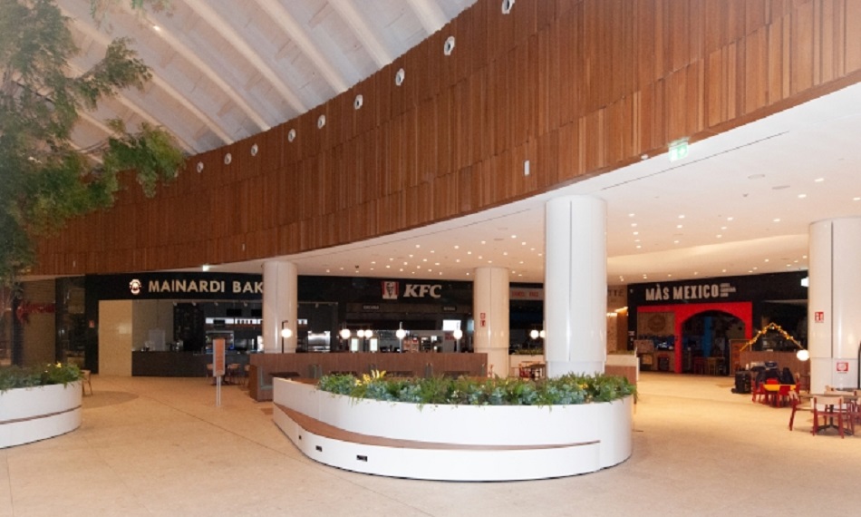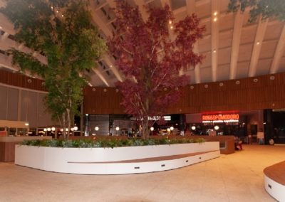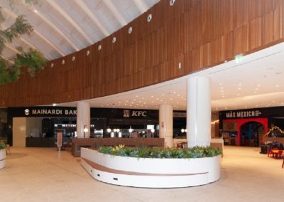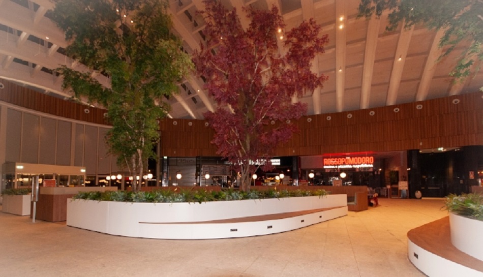 Corte del gusto Curno. Tavoli in Fenix, Sedute in laminato con imbottitura ecopelle, Fioriere in laminato bianco full-color