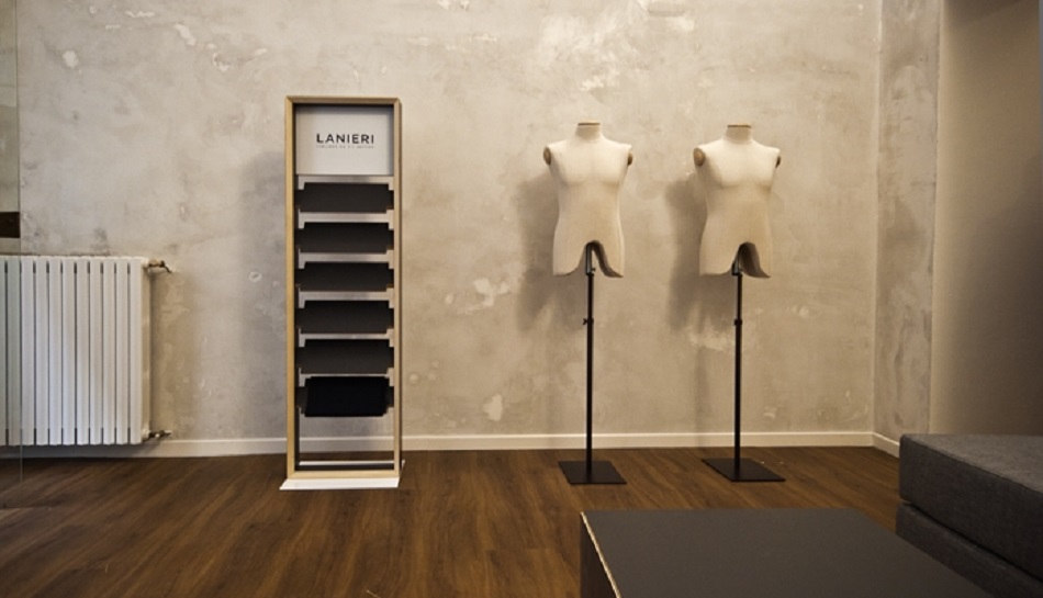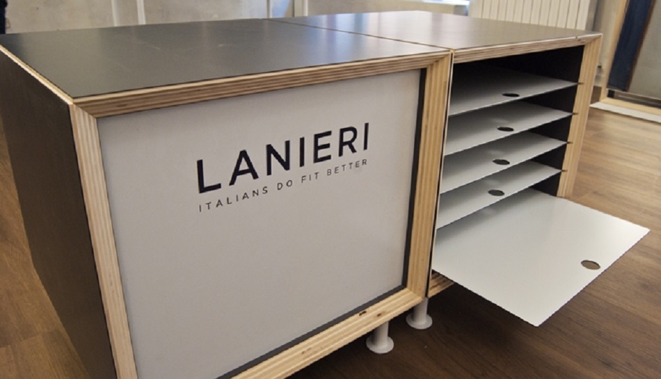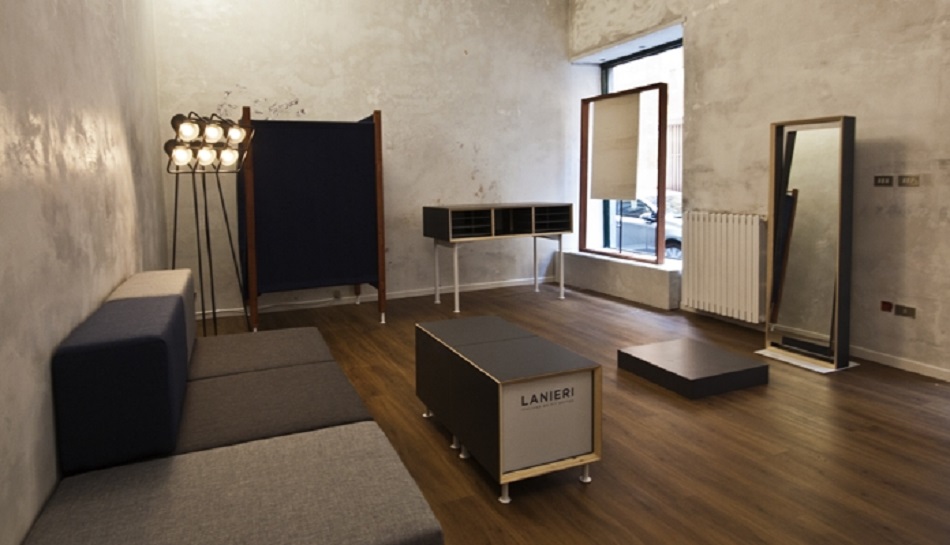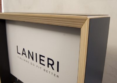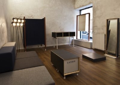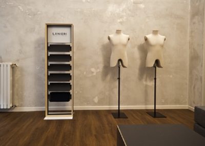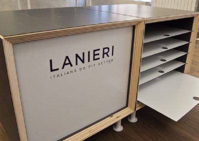 Realizzazione degli arredi per lo showroom Lanieri in centro a Torino. Su disegno dell’architetto Davide Negri, siamo riusciti a unire semplicità ed eleganza, usando materiali base come il laminato e il multistrato, valorizzandoli con un taglio a 45°.